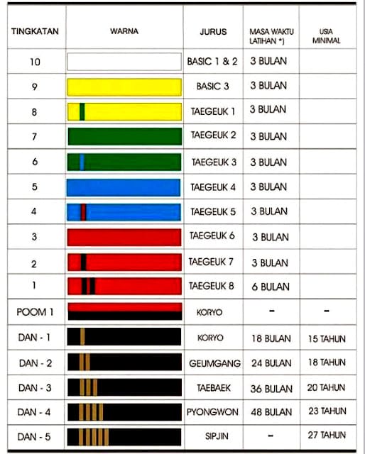 Urutan sabuk Taekwondo secara lengkap dimulai dari Putih, lalu Kuning, Hijau, Biru, Merah, dan terakhir Hitam. Setiap warna dasar ini memiliki tingkatan tambahan, seperti strip atau garis berwarna, yang menunjukkan kemajuan dalam pemahaman teknik dasar hingga tingkat lanjut.